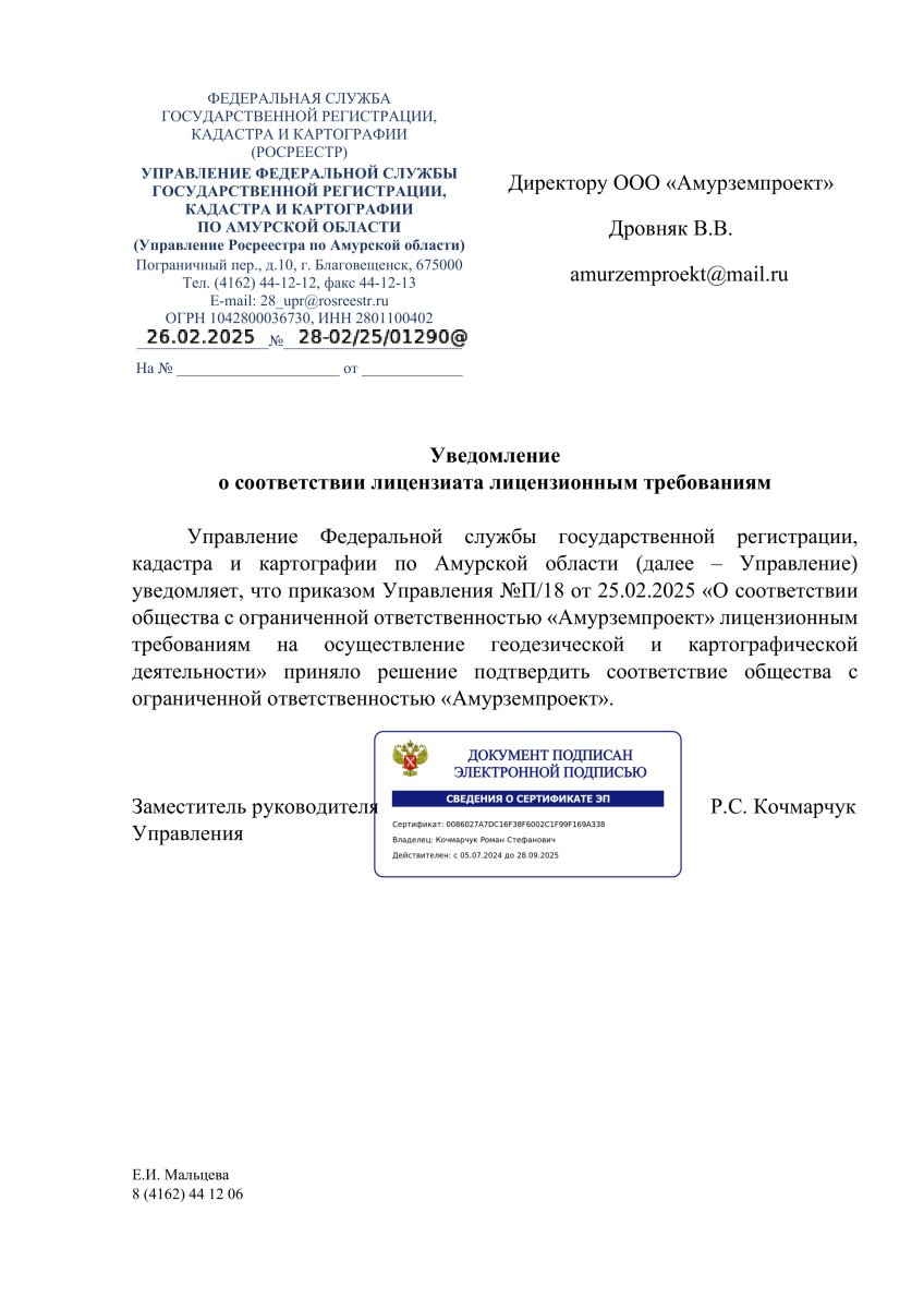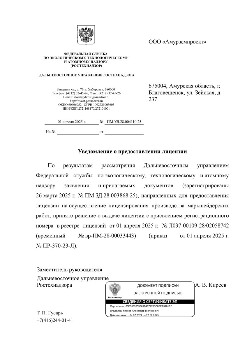 ООО «Амурземпроект» имеет все необходимые документы для осуществления деятельности: